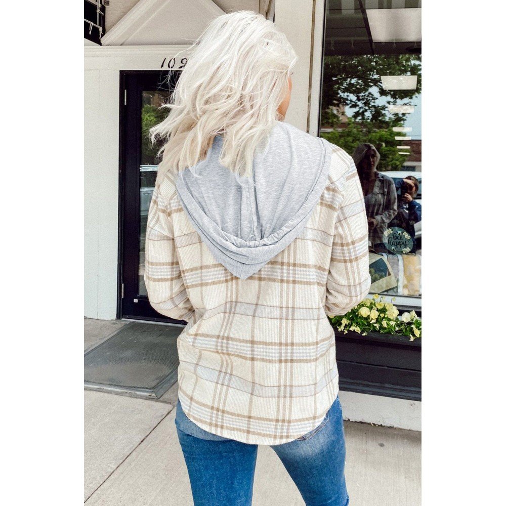 Stylish shacket jacket with buttons closure, flap pockets and contrast solid hood on the back