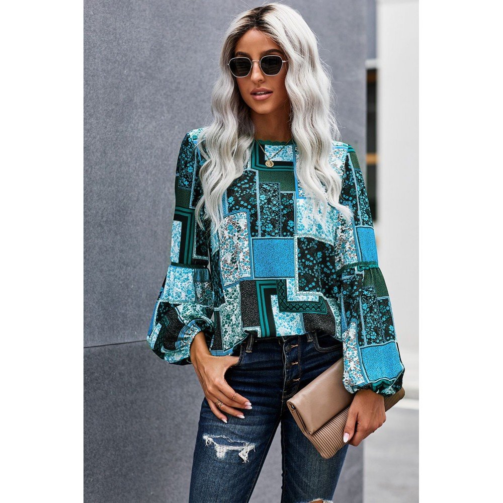 Fit with a round neckline and long sleeves while crochet trim and mini ruffles detail the look
