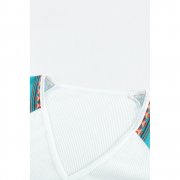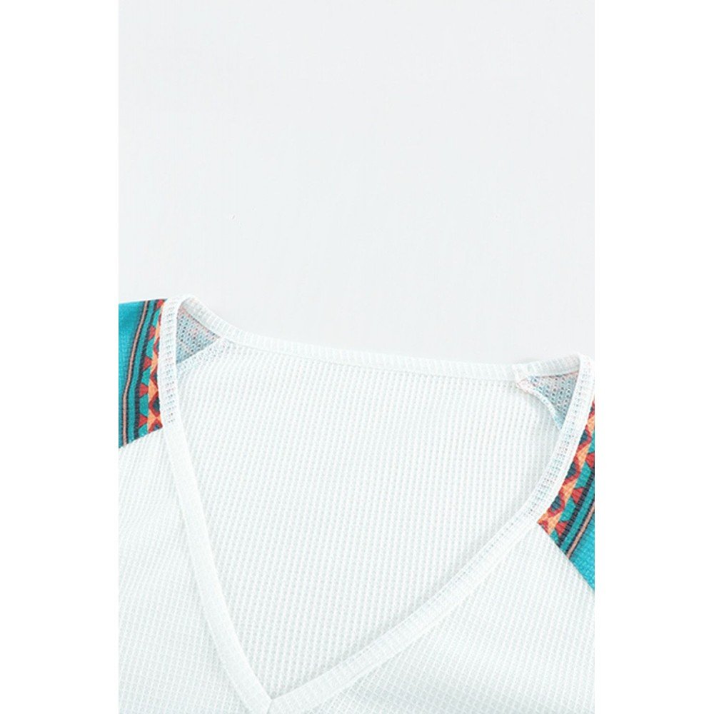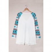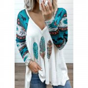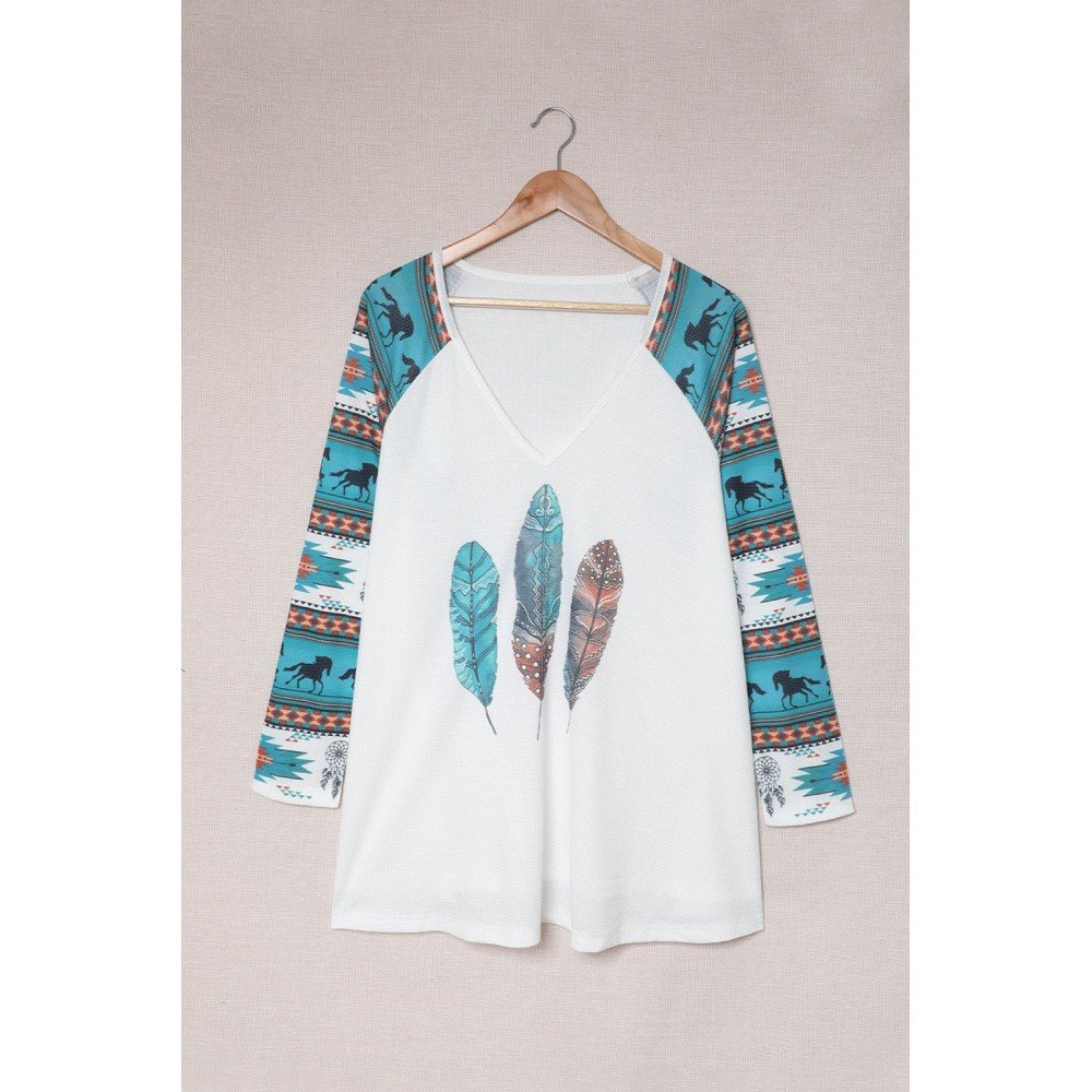 Tribal print raglan sleeve and feather graphic body splicing construct this fashionable top