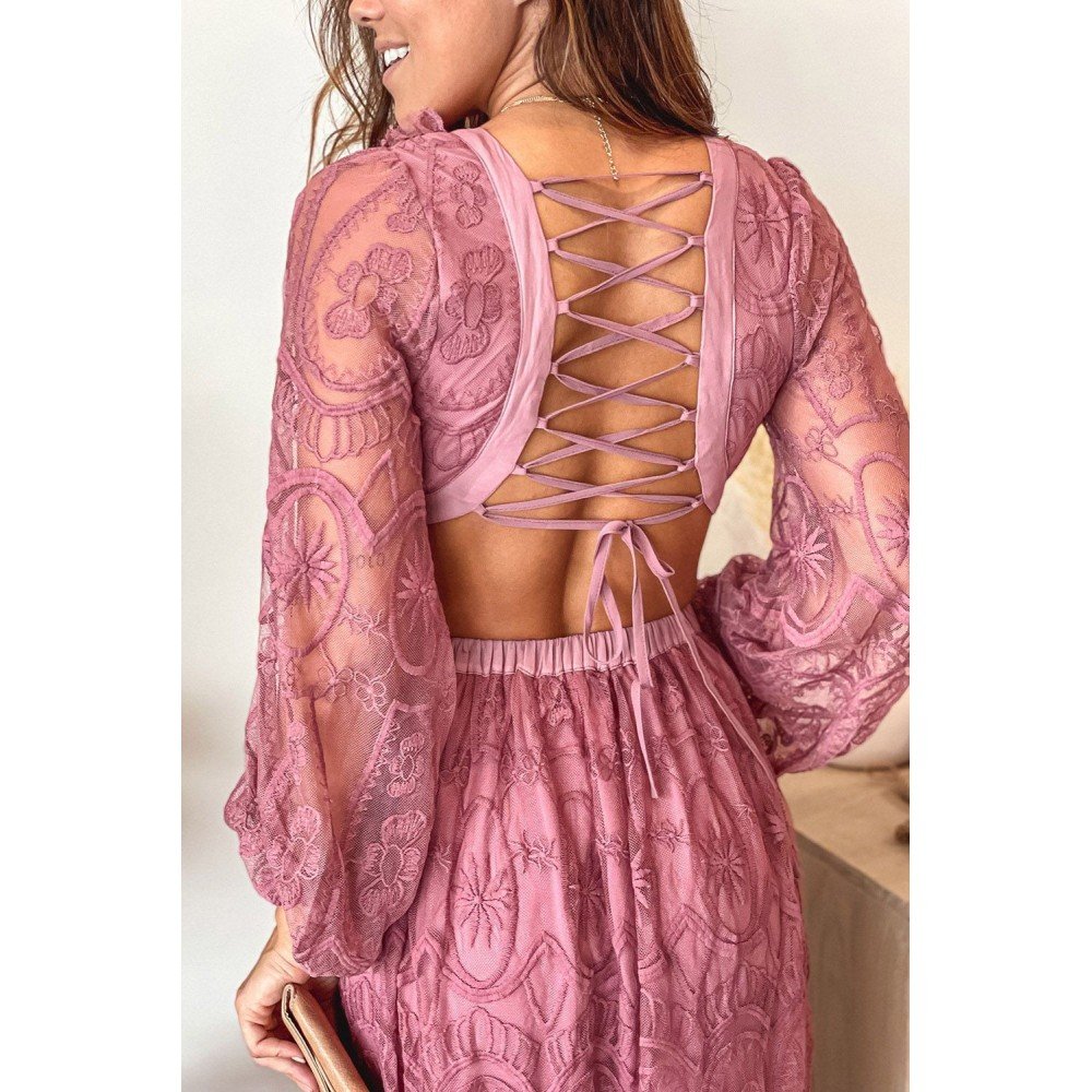 We absolutely love the beautiful lace throughout, long sleeves and the adorable lace up back