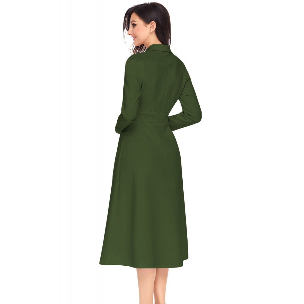 Our new vintage style swing dress, with flattering fitted long sleeves, would look perfect at any formal or informal occasion! Featuring a wrap over style bust, chic v-neckline with retro style collar, fitted waistband, faux banded waistline, button details and a gorgeous full circle skirt. This flirty vintage dress is made from lovely soft fabric with stretch and fastens with a concealed side zip.